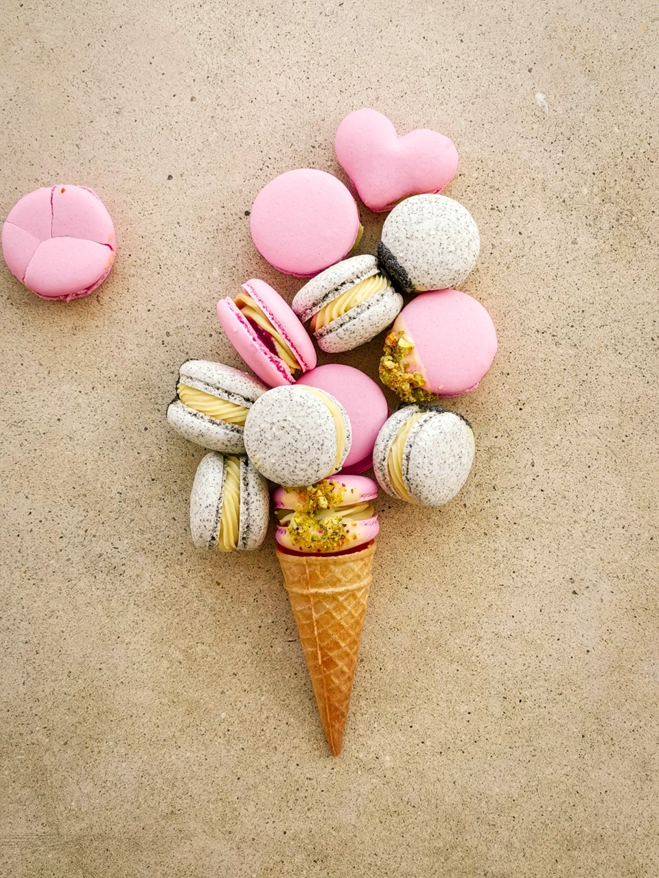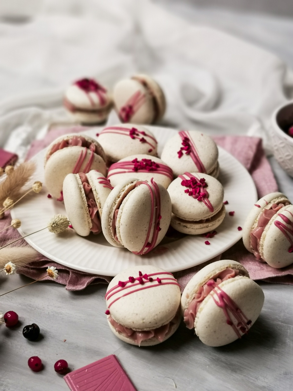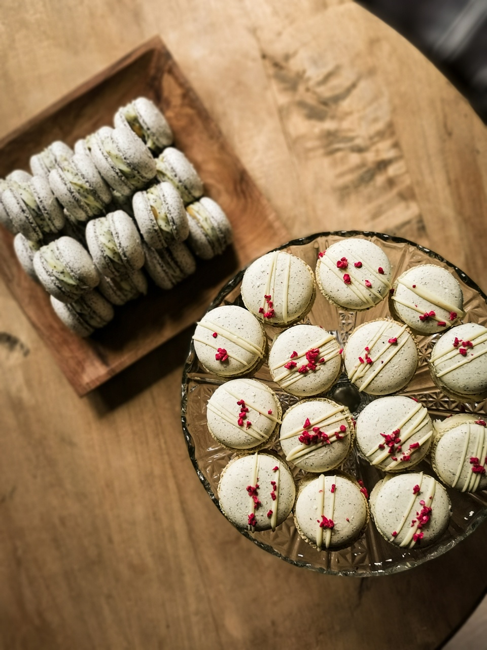 A macaronokat olasz, cukorszirupos módszerrel készítem, a héjak színezéséhez csak kifejezett kérés esetén használok mesterséges színezéket. A töltelék alapja minden esetben prémium minőségű csokoládé, magas zsírtartalmú tejszín és 100%-os gyümölcstartalmú pürék, illetve 100%-os magvajak.