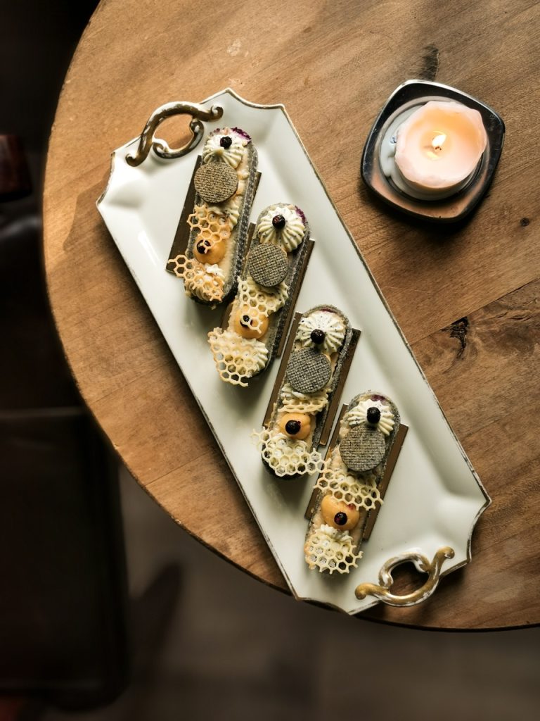 Téli merengő: feketeszezámos tart, üde feketeribizli ragu, selymes vaníliakrém, mákos fehércsokoládé namelaka, liofilizált feketeribizli