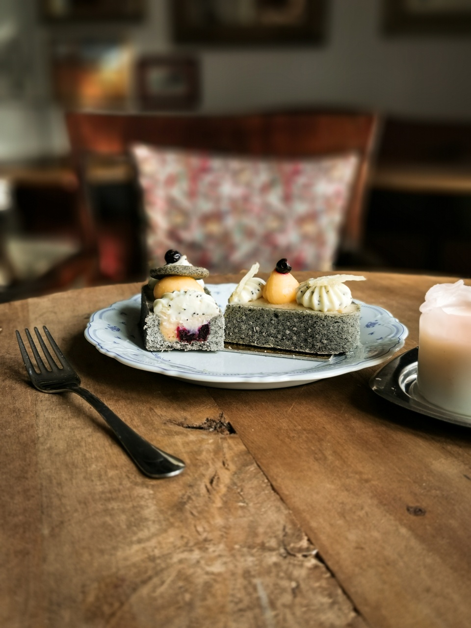 Téli merengő: feketeszezámos tart, üde feketeribizli ragu, selymes vaníliakrém, mákos fehércsokoládé namelaka, liofilizált feketeribizli